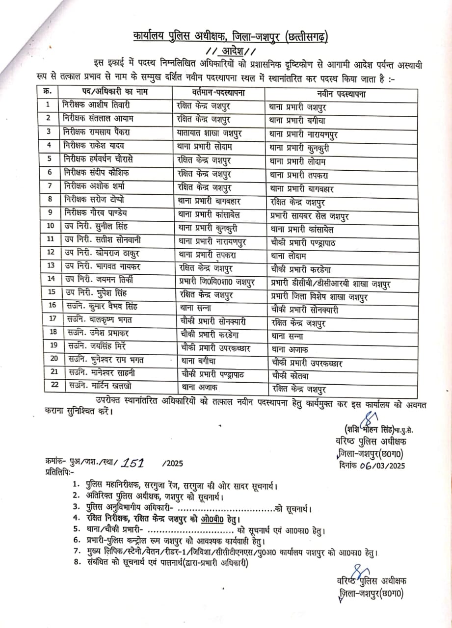 जशपुर पुलिस विभाग में बड़ा फेरबदल, कई थाना और चौकी प्रभारी बदले गए