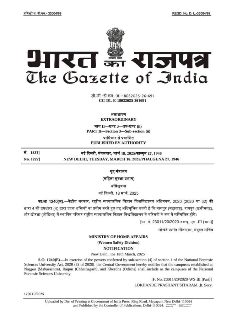 फॉरेंसिक विज्ञान के क्षेत्र में छत्तीसगढ़ को ऐतिहासिक उपलब्धि मिली है। केंद्रीय गृह मंत्रालय ने रायपुर स्थित परिसर को राष्ट्रीय न्यायालयिक विज्ञान विश्वविद्यालय (एनएफएसयू )के आधिकारिक परिसर के रूप में अधिसूचित कर दिया है। इस पहल के लिए प्रदेश के डिप्टी सीएम विजय शर्मा और वित्त मंत्री ओपी चौधरी ने प्रधानमंत्री नरेंद्र मोदी और केंद्रीय गृह मंत्री अमित शाह का आभार व्यक्त किया है।